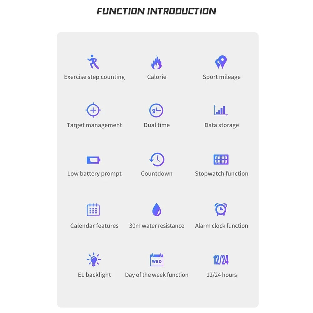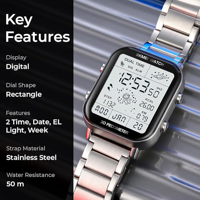 - Многофункциональные цифровые спортивные часы: эти часы сочетают стиль и функциональность, оснащены современными функциями, такими как 3D-шагомер, секундомер, таймер обратного отсчёта и режим двойного времени — идеальный выбор для любителей фитнеса и повседневного использования.