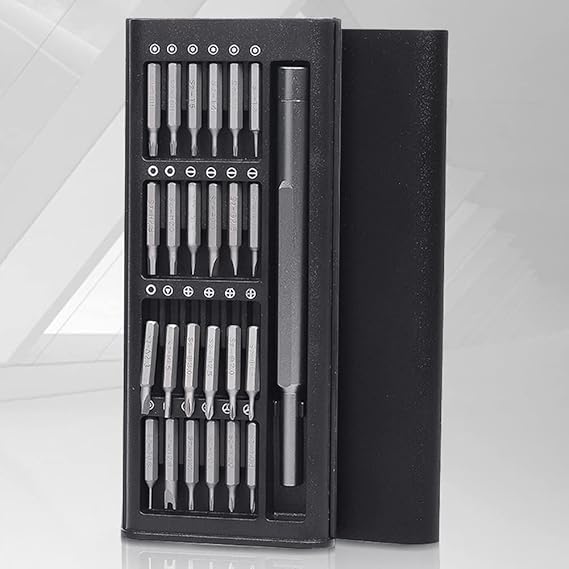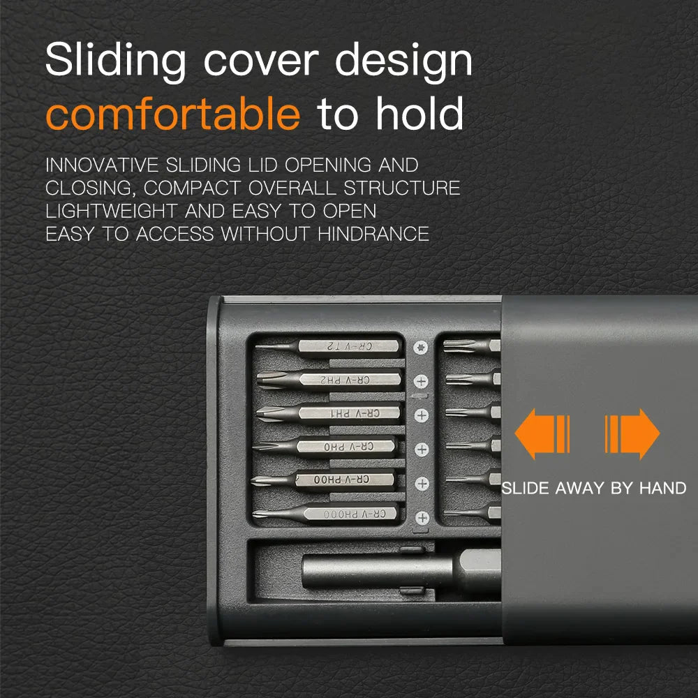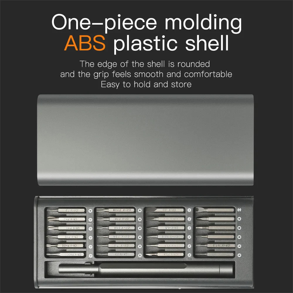• 24 насадки высокой точности: 24 сменные биты — звёздочные, шестигранные и другие. Разные отвёртки подходят для большинства винтов, используемых в современной электронике.