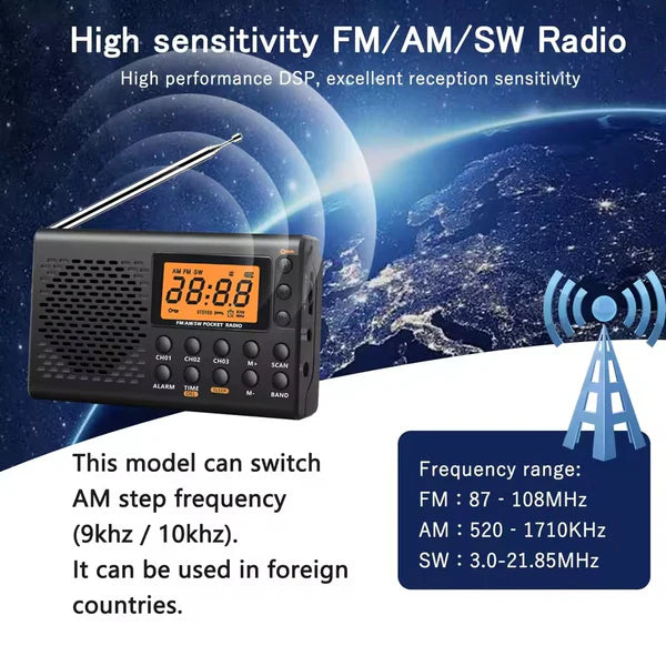 • Будильник и таймер сна : транзисторное радио AM оснащено функцией будильника и таймером сна от 10 до 90 минут. Оно может разбудить вас вовремя и чётко отображает время. Портативное коротковолновое радио поддерживает функцию календаря, позволяя видеть текущую дату, месяц и год на ЖК-экране.