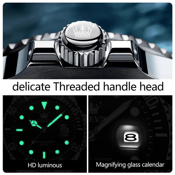 - Изысканное исполнение : Высококачественный кварцевый механизм обеспечивает точное время. Односторонний вращающийся безель позволяет точно отслеживать прошедшее время. Крупные стрелки и чёткие метки легко читаются, а увеличенное окошко даты гарантирует, что вы всегда будете в курсе.