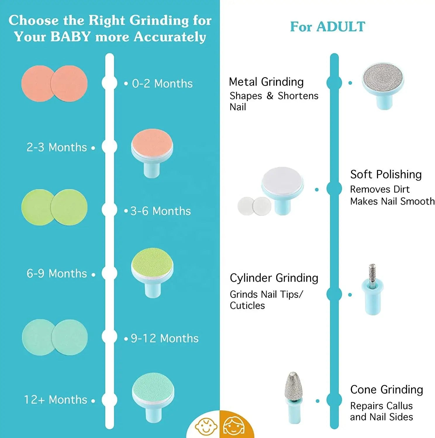 - Электрический детский набор для подстригания ногтей : Эта электрическая пилка для ногтей оснащена 6 различными насадками для шлифовки. Подходит для всех возрастов — выберите насадку, соответствующую вашим потребностям.