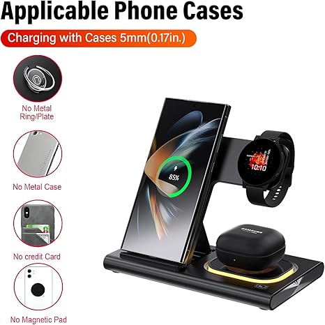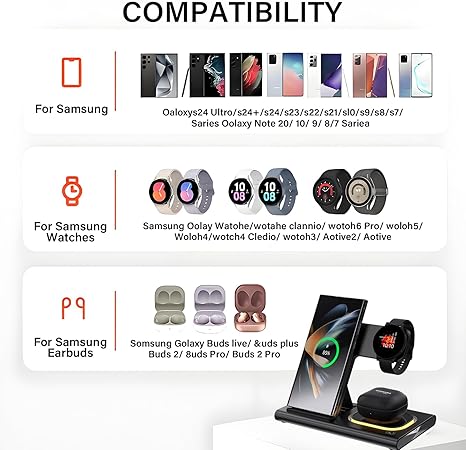 - Универсальное зарядное устройство для устройств Samsung : Беспроводное зарядное устройство 3 в 1 специально разработано для пользователей Samsung. Оно позволяет одновременно заряжать смартфон, умные часы и наушники Galaxy Buds. Благодаря единой конструкции, устройство заменяет несколько проводов и зарядных станций, обеспечивая удобство и порядок.