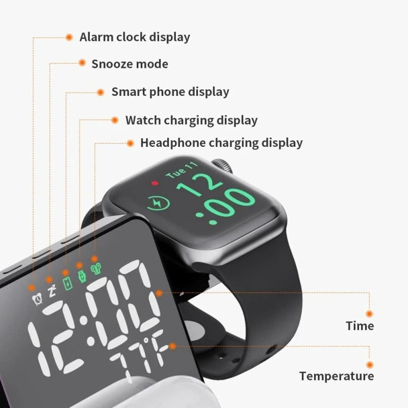 - Многофункциональный дисплей: Встроенный экран чётко отображает время, дату и другую полезную информацию. Это превращает станцию в современные настольные часы или будильник у кровати.