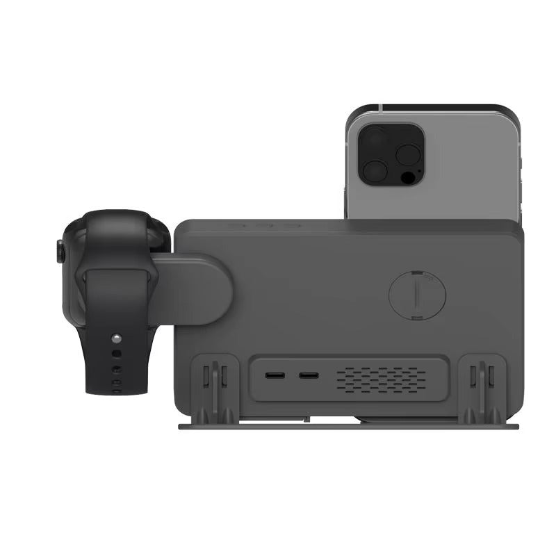 - Компактный и организованный дизайн: Складная конструкция и продуманное расположение помогают экономить место на рабочем столе или тумбочке. Станция удерживает устройства в вертикальном положении для удобного просмотра и аккуратного внешнего вида.