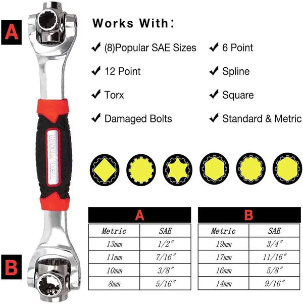 - 48 инструментов в одной головке : уникальная революционная конструкция зубьев позволяет работать как со стандартными, так и с метрическими размерами. Достаточно просто перевернуть инструмент — и у вас появляется больше размеров. Больше нет необходимости таскать тяжёлые ящики с инструментами.