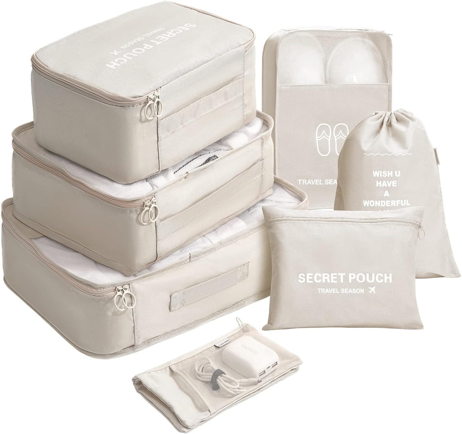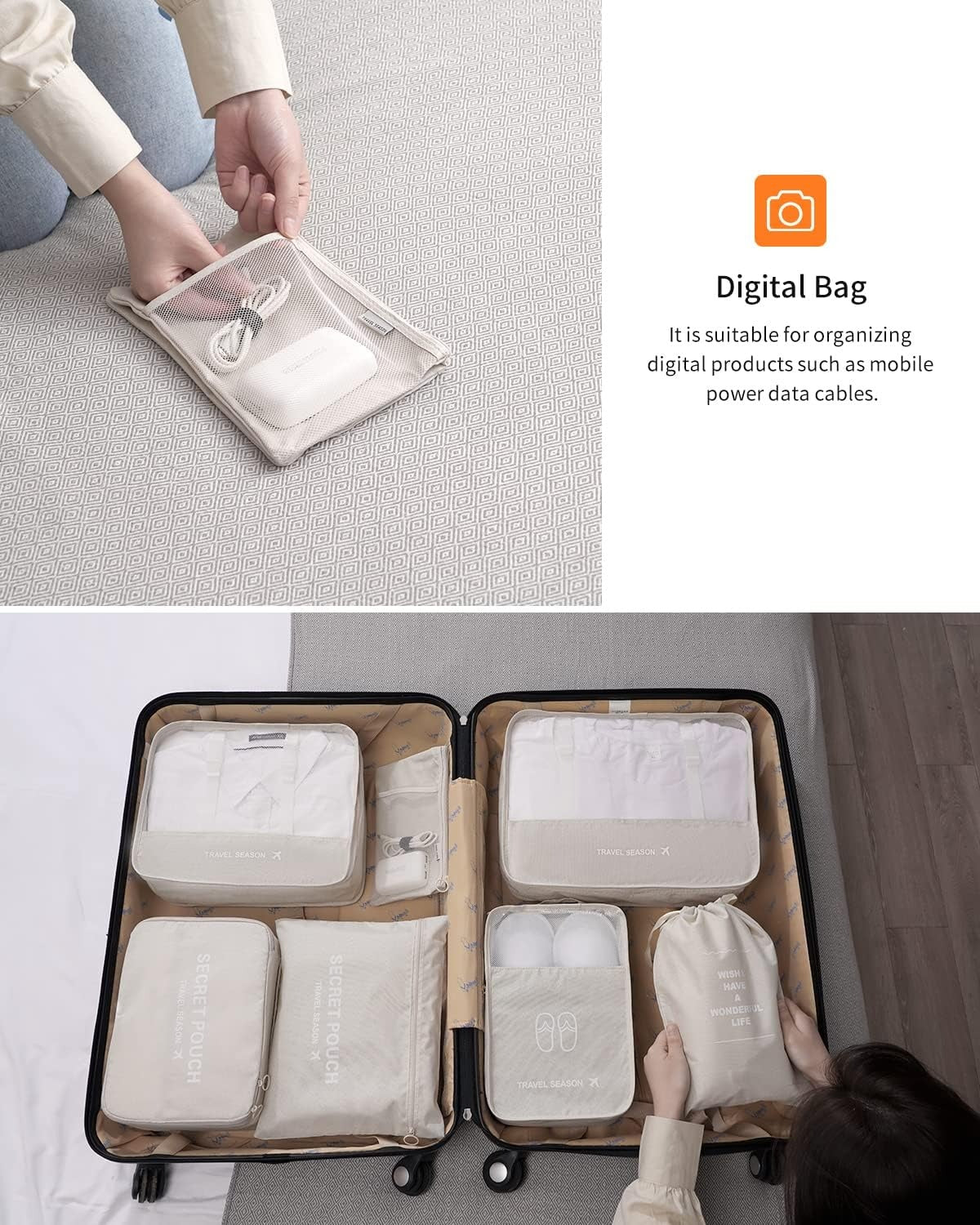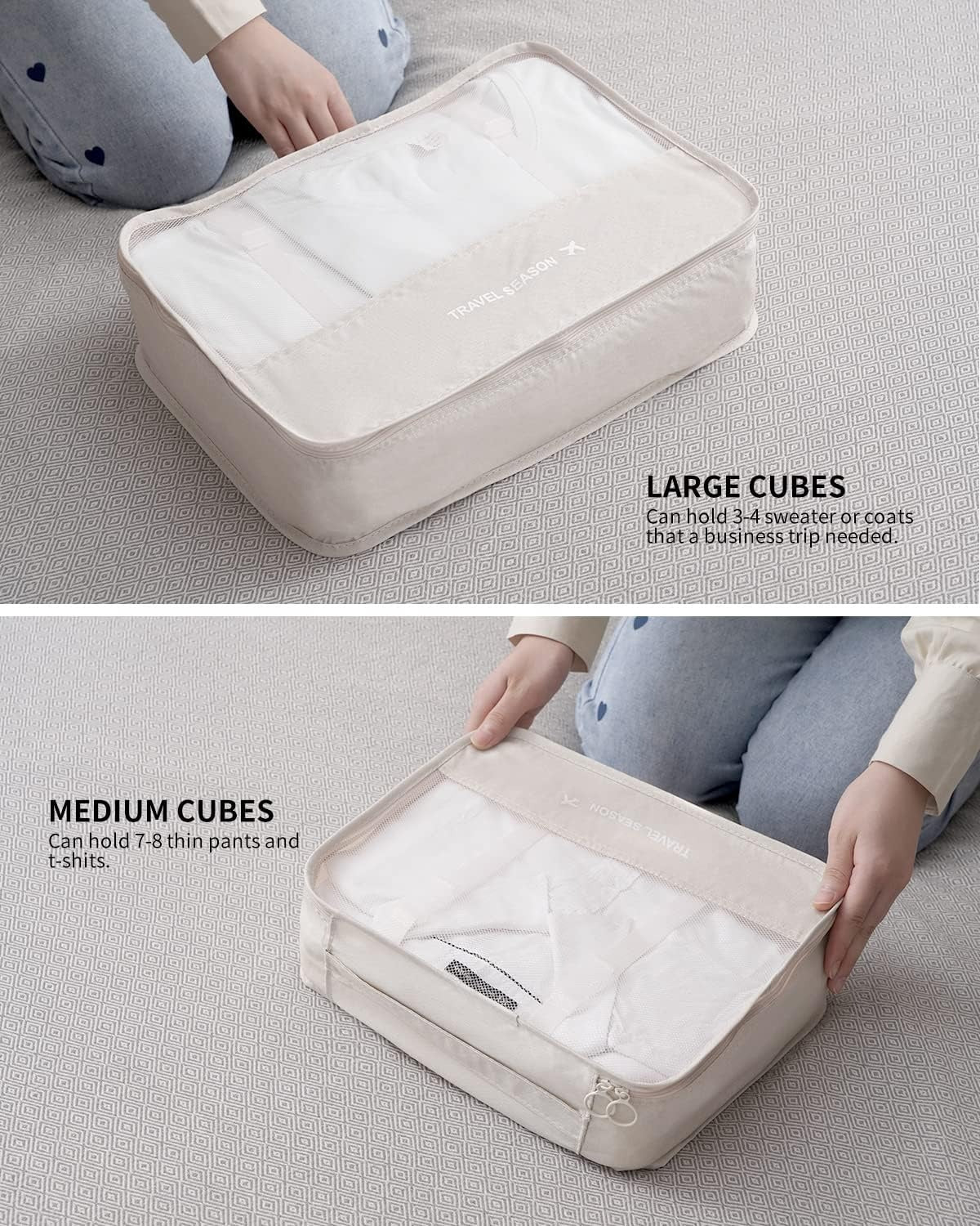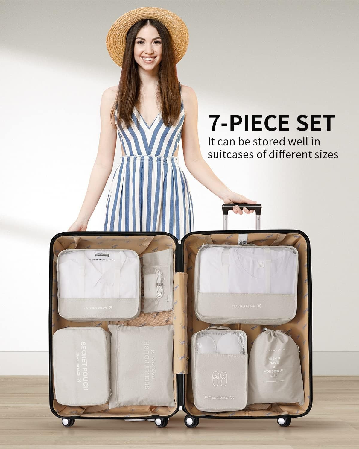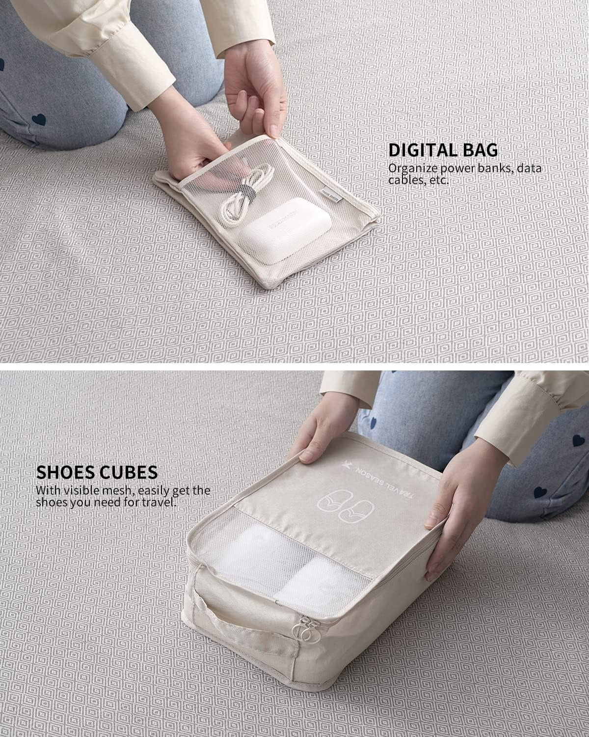 - Органайзеры для упаковки 7 шт: Набор включает 7 различных сумок, которые подойдут для всех типов вещей. В комплект входят 3 куба для одежды разных размеров (большой: 14.56" × 11" × 4.3", средний: 12.2" × 9.8" × 4.3", маленький: 11" × 7.87" × 4.3"), сумка для обуви (11.4" × 7.5" × 4.3"), мешок для стирки (13.4" × 10.23"), косметичка (13" × 10.23") и сумка для цифровых аксессуаров (9.45" × 6.3").