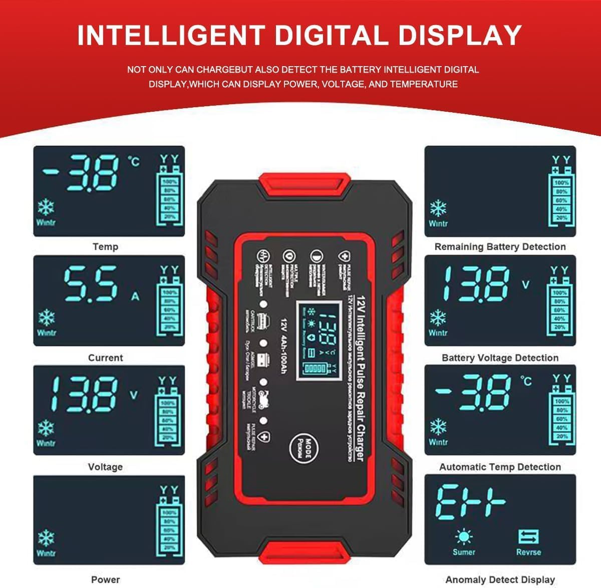 - Интеллектуальный цифровой дисплей : Большой ЖК-дисплей отображает состояние зарядки и состояние батареи: напряжение зарядки, ток зарядки, температуру воздуха, заряд батареи, летний и зимний режимы и др. Когда батарея полностью заряжена, на экране отображается «100%» и зарядка автоматически прекращается.