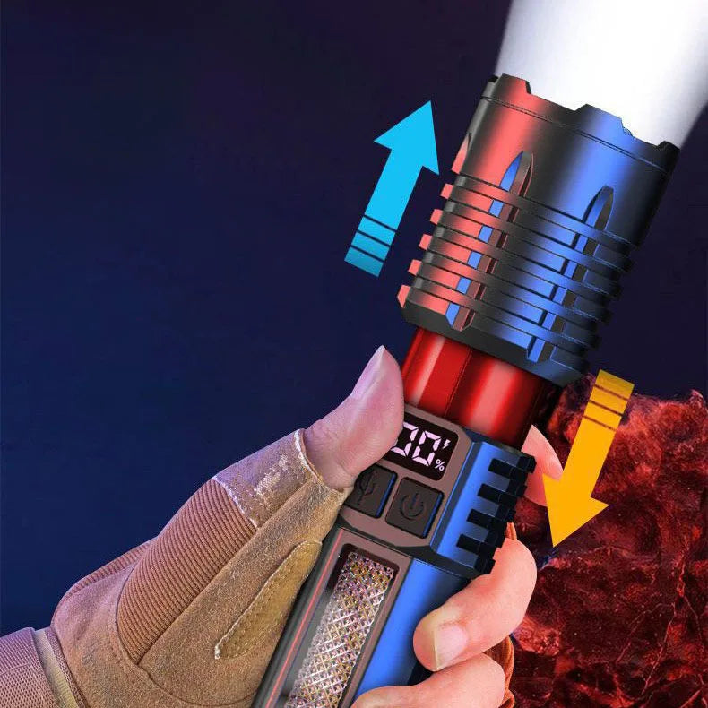 - Экстремальная яркость : С яркостью до 10 000 000 люменов, этот светодиодный фонарик обеспечивает невероятно мощный световой поток, освещая самые тёмные участки с исключительной чёткостью. Идеально подходит для активного отдыха, экстренных ситуаций и ночных работ.