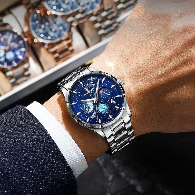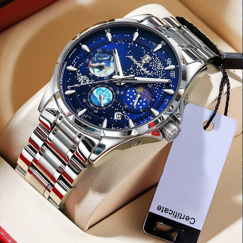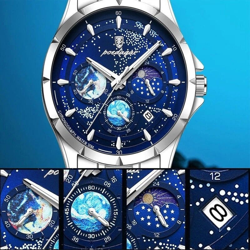 - Элегантный небесный дизайн: Эти часы выделяются циферблатом, вдохновлённым вселенной, с деталями, напоминающими звездное небо. Их уникальный стиль сразу привлекает внимание и добавляет изысканности любому образу.