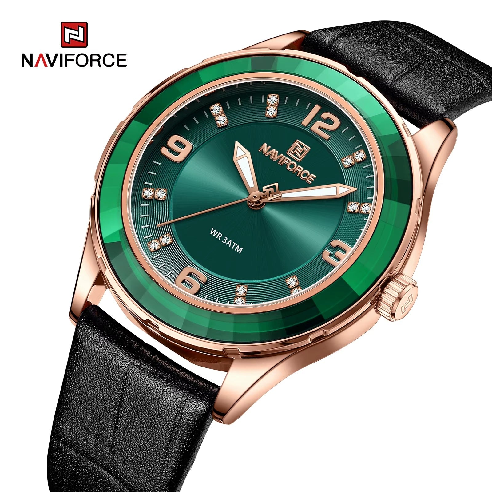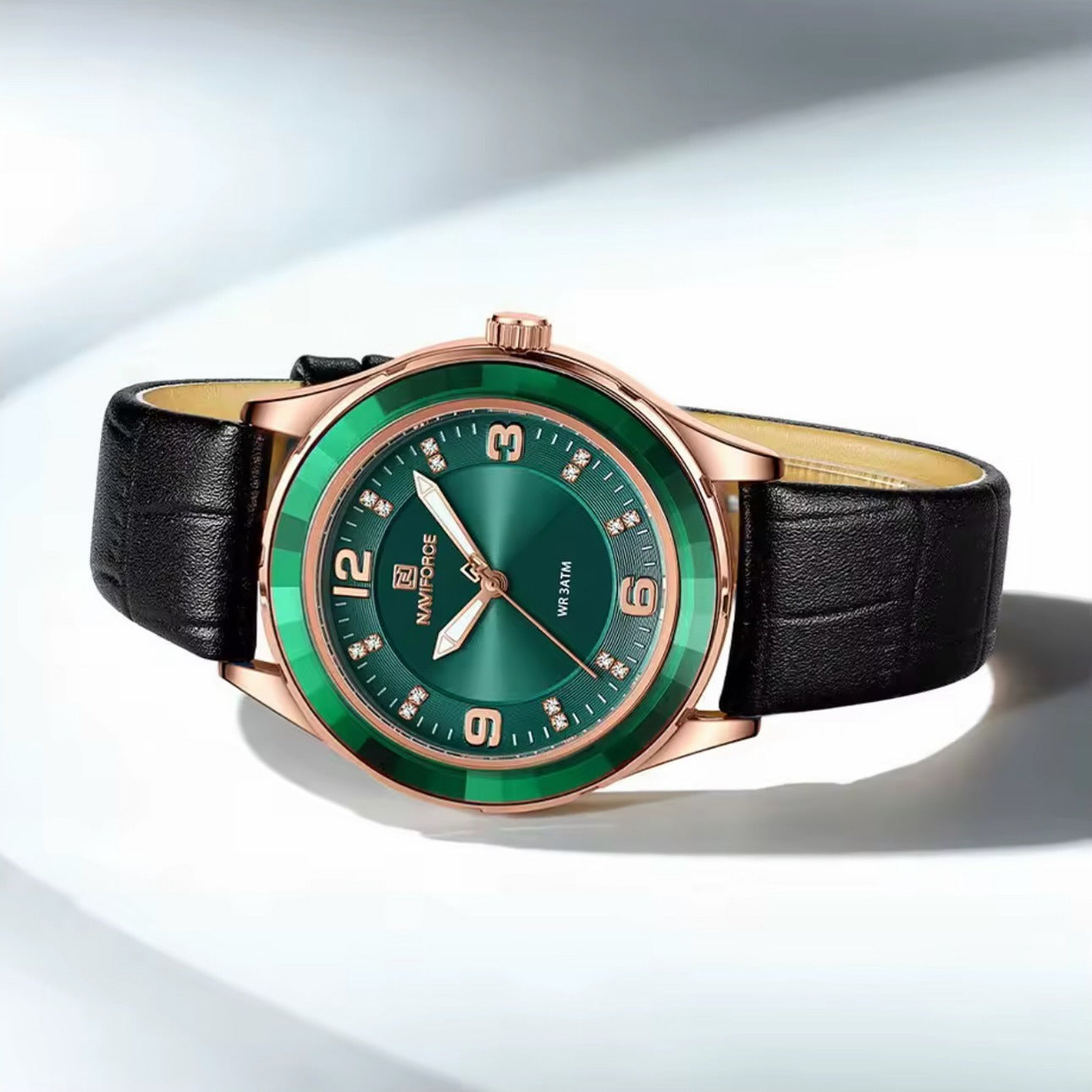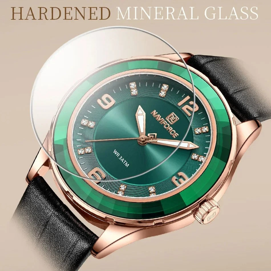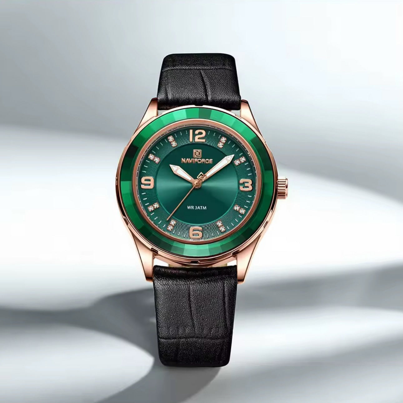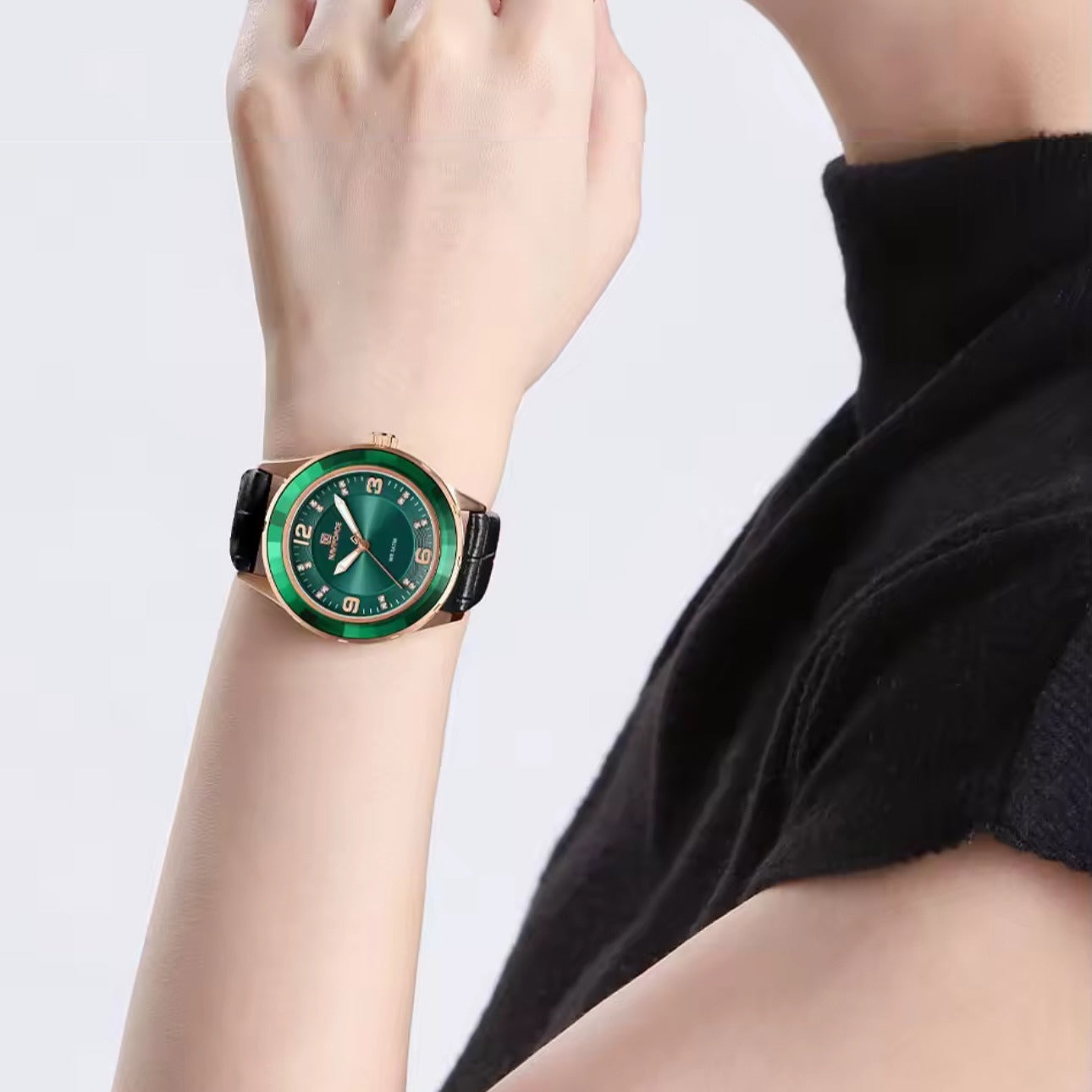 - Элегантный дизайн: Эти часы отличаются утончённым дизайном, сочетающим глубокий зелёный циферблат с корпусом цвета розового золота. Такое сочетание создаёт изысканный контраст, который сразу привлекает внимание. Их элегантный внешний вид делает часы идеальным аксессуаром для тех, кто хочет подчеркнуть свой стиль с уверенностью.