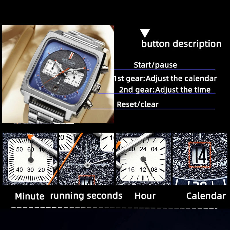 Мужские наручные часы с квадратным циферблатом и хронографом