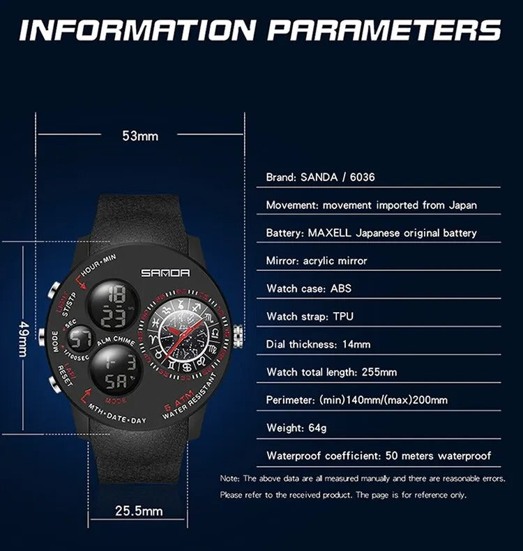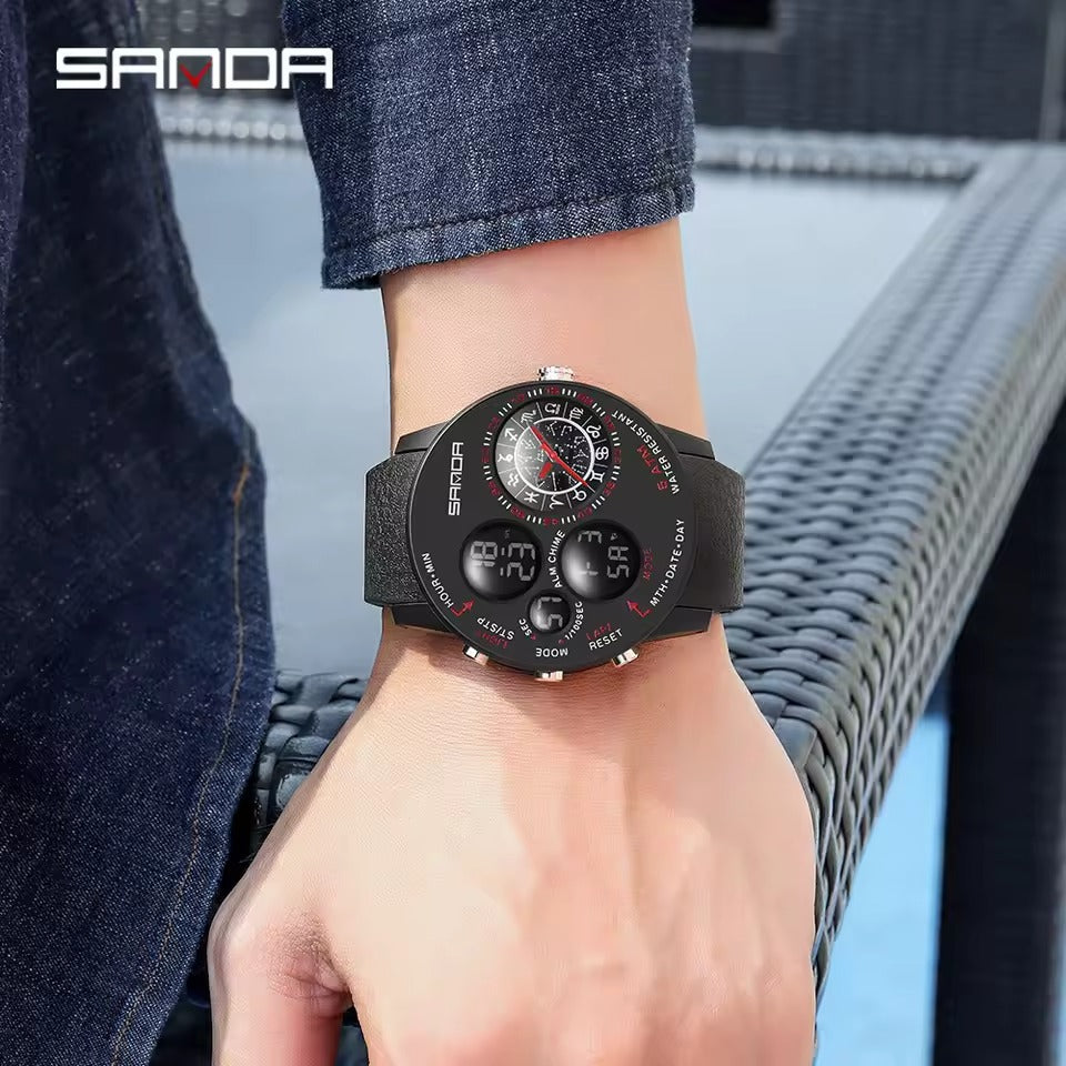 - Многозадачный дисплей : Часы оснащены несколькими цифровыми окнами, отображающими время, дату, день недели и другие полезные функции. Аналоговая часть с яркими стрелками создаёт выразительный контраст и подчёркивает креативность дизайна.