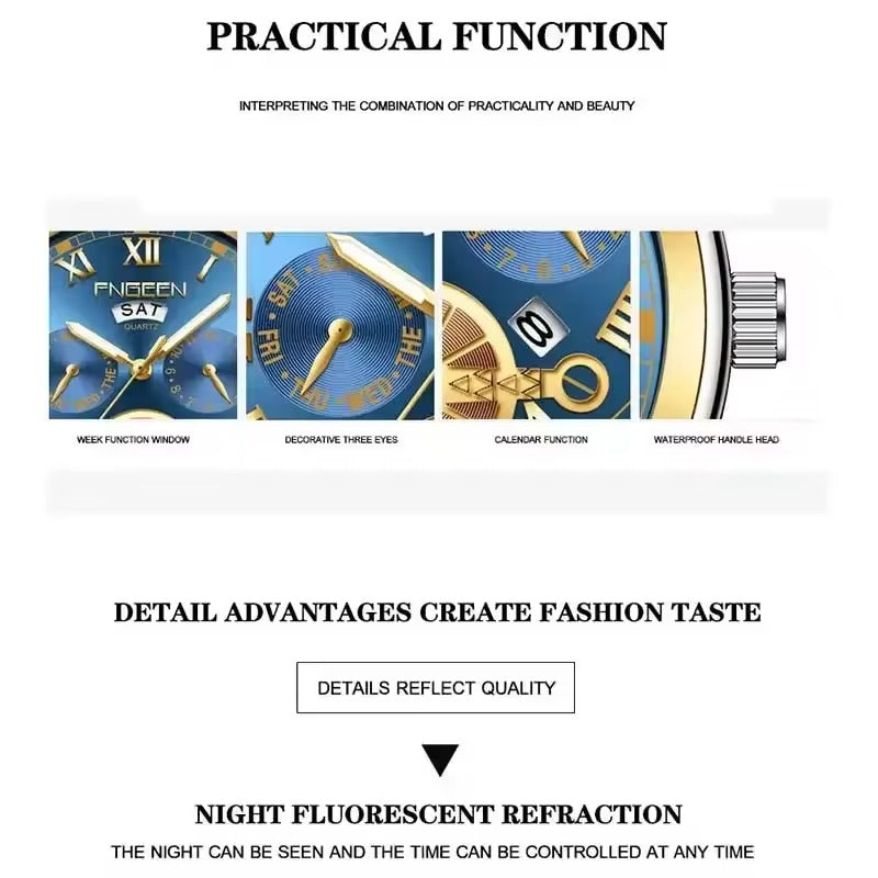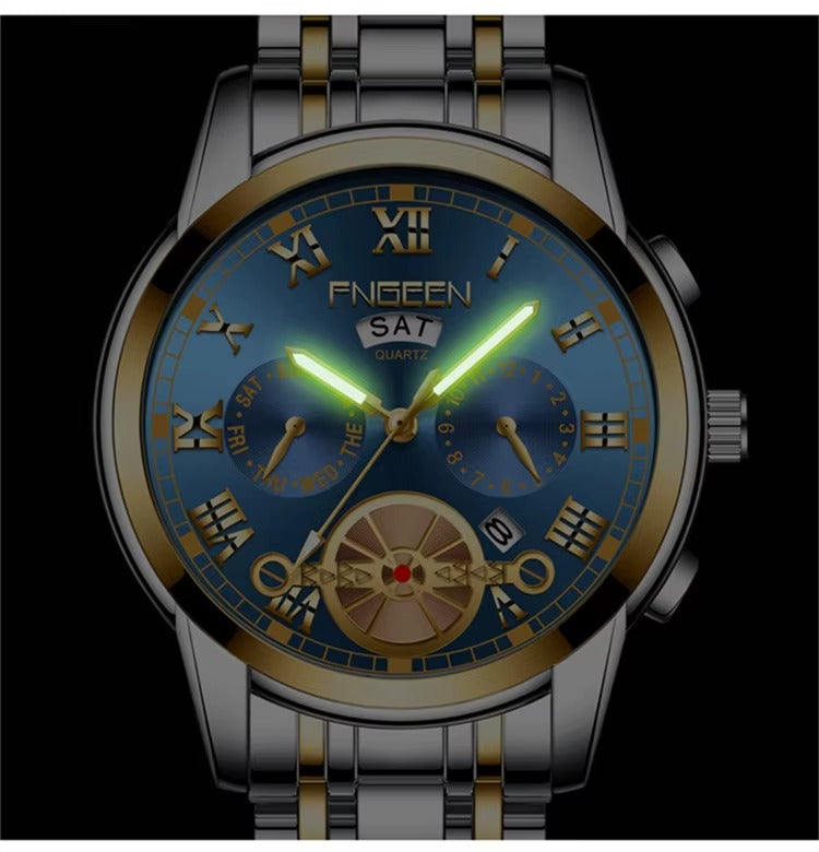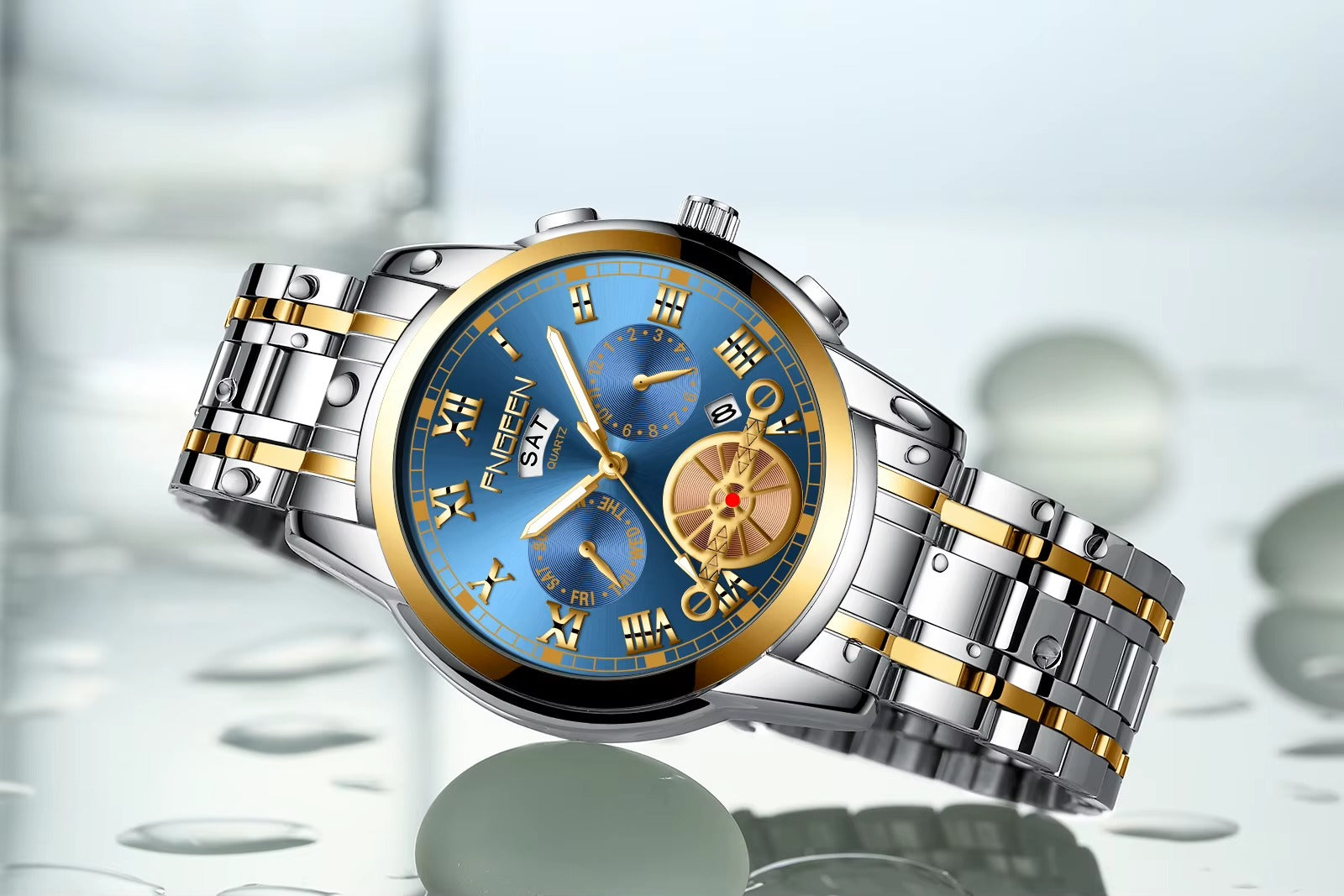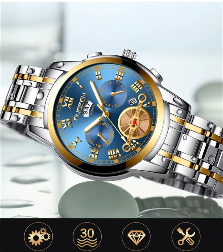 - Элегантный и утончённый дизайн: Эти часы привлекают внимание с первого взгляда благодаря своему современному и изысканному стилю. Глубокий синий циферблат с золотистыми деталями и римскими цифрами придаёт модели роскошный вид, который идеально подходит как к классическому, так и к повседневному образу.
